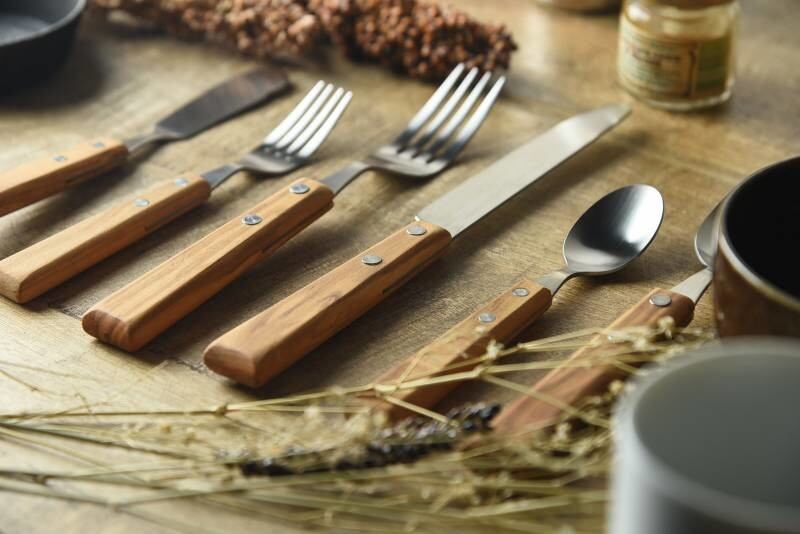 天然木のサラサラとしたナチュラルな手触りと、ステンレス製のすくいやすく切りやすい先端が、キャンプやBBQなどのアウトドアにもピッタリなカトラリー。がっつりお肉やパスタもおてのものです!