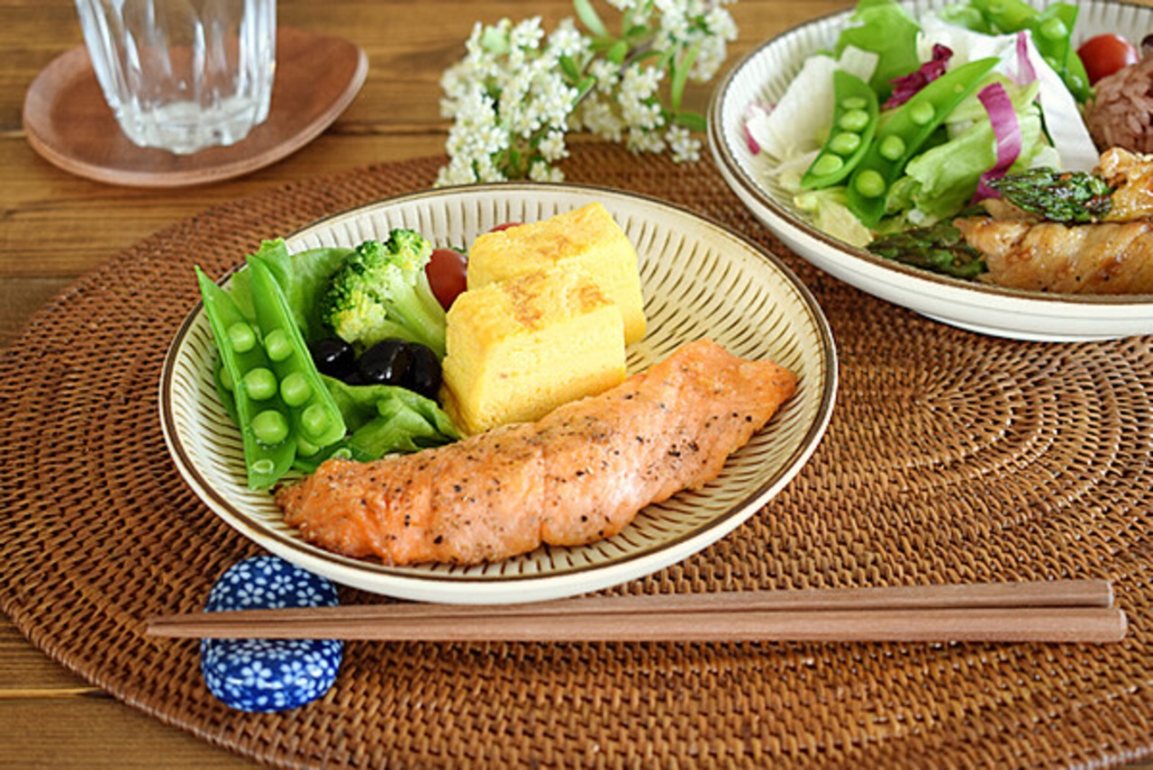 素朴さを感じる色合いと、目を引く細かなトチリ模様。品よく、そして温かみのあるテーブルコーデにととのえてくれるシリーズです。