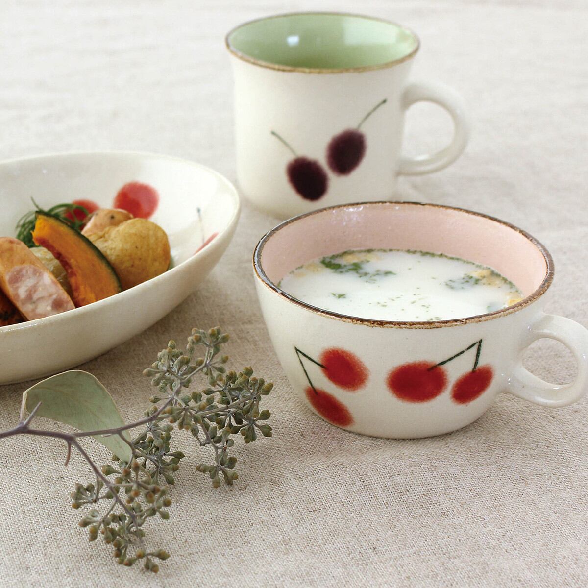<recolte>レコルトシリーズ大胆に配置された手描きのチェリーとオリーブが印象的。マグなどの内側はカラーになっています。